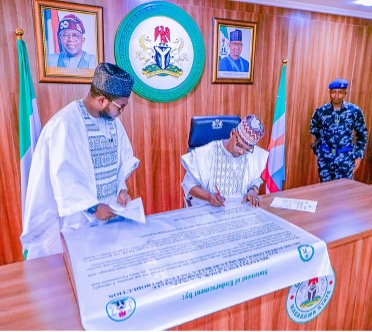 His Excellency, Governor Abdullahi Sule, Governor of Nasarawa State, signing a commitment letter to ensure state ownership and guarantee that every eligible child in Nasarawa receives the Measles-Rubella vaccine, at the Government House, Lafia, Nasarawa State, in May 2025.