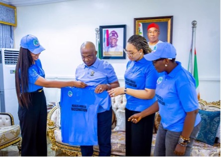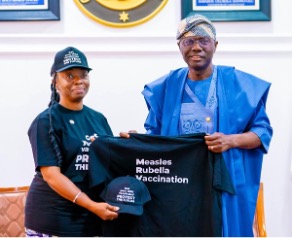 Nationwide Measles-Rubella Vaccination Campaign advocacy meeting with Babajide Sanwo-Olu, Executive Governor of Lagos State, led by Ibijoke Sanwo-Olu, First Lady of Lagos State, at the Lagos State Government House, Lagos, on August 18, 2025. The meeting focused on strengthening state support and political commitment for the Measles-Rubella vaccination
